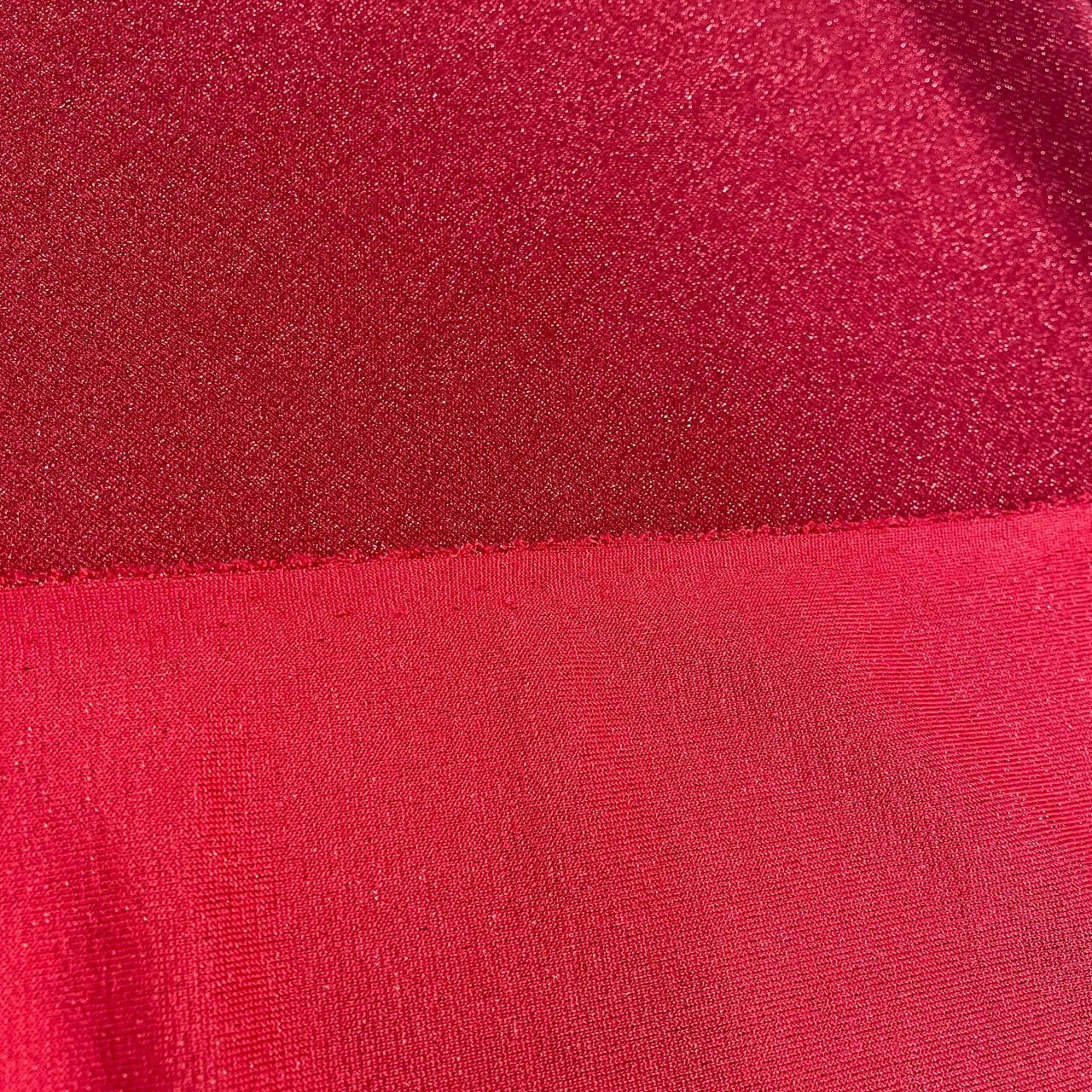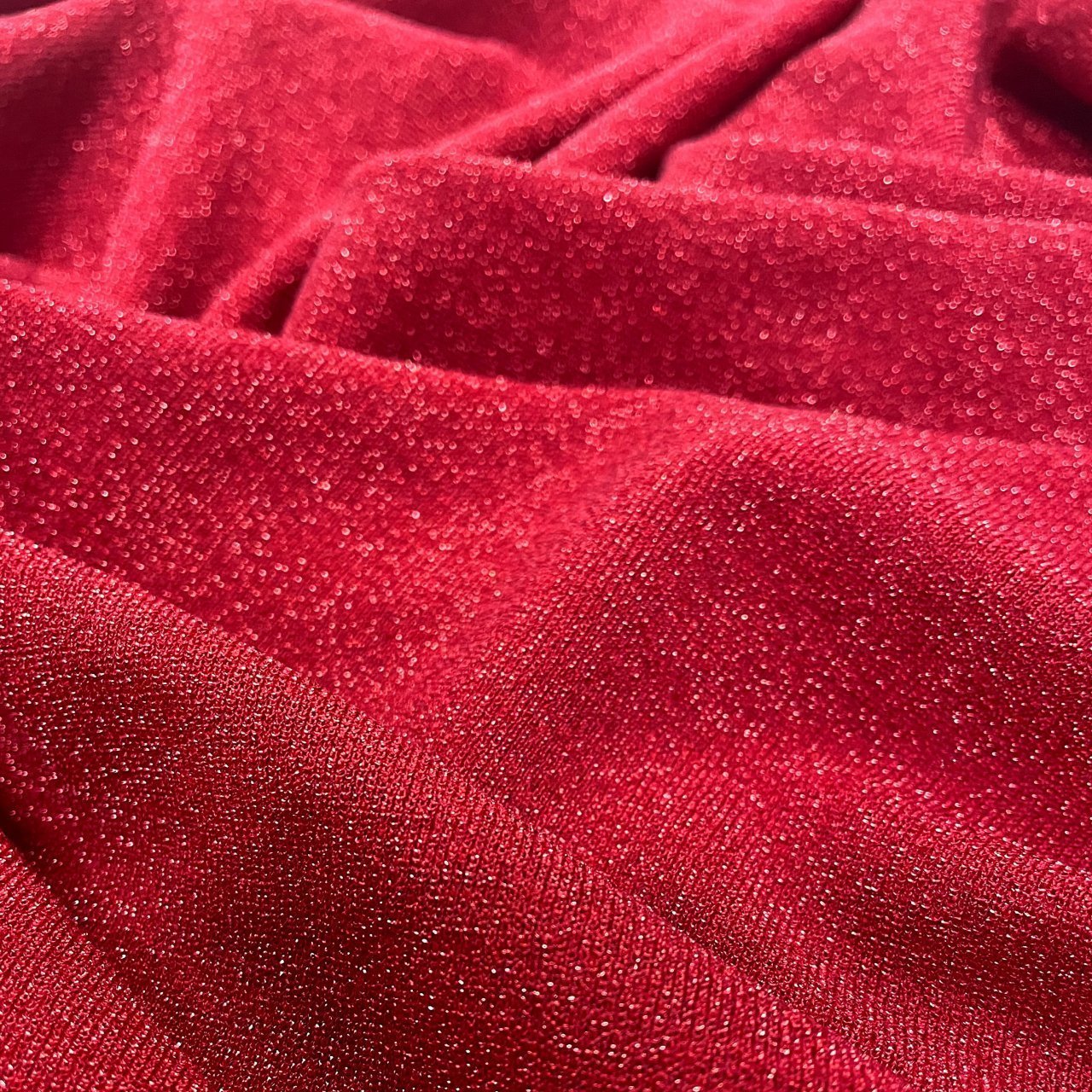 Вязанное трикотажное полотно, хорошо растяжимое. Люрексовая нить выведена на лицевую сторону, что придает ткани особый шик. Хорошо подойдет для пошива платьев, туник, футболок и другой легкой одежды. Не прихотлив в носке и уходе.