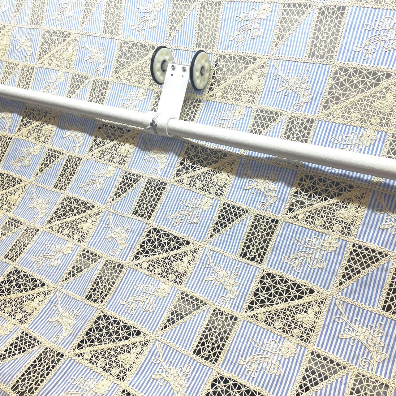 Тонкая смесовая ткань с интересным принтом из вставок с льняной вышивкой. Хорошо впитывает влагу, комфортна при носке. Держит форму. Прекрасно подходит для пошива платьев, сорочек, одежды в спортивном и романтичном стиле. Особо модная полоска и сочетание фактур позволит не только сшить изделие классической формы, но и поэкспериментировать с геометрией рисунка.